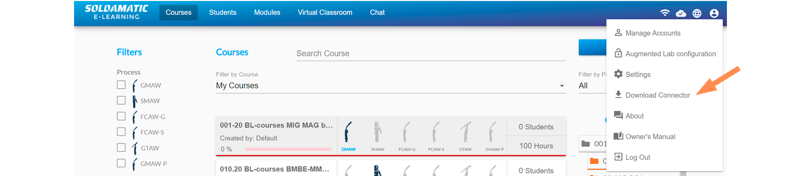 Soldamatic e-Learning is an LMS (Learning Management System) based on Moodle and designed to manage and administer the teaching and learning process of welding from the simulator. This platform provides access to the Soldamatic Database and therefore acts on it. Like any LMS it has two types of access, one for the teacher and one for the student.