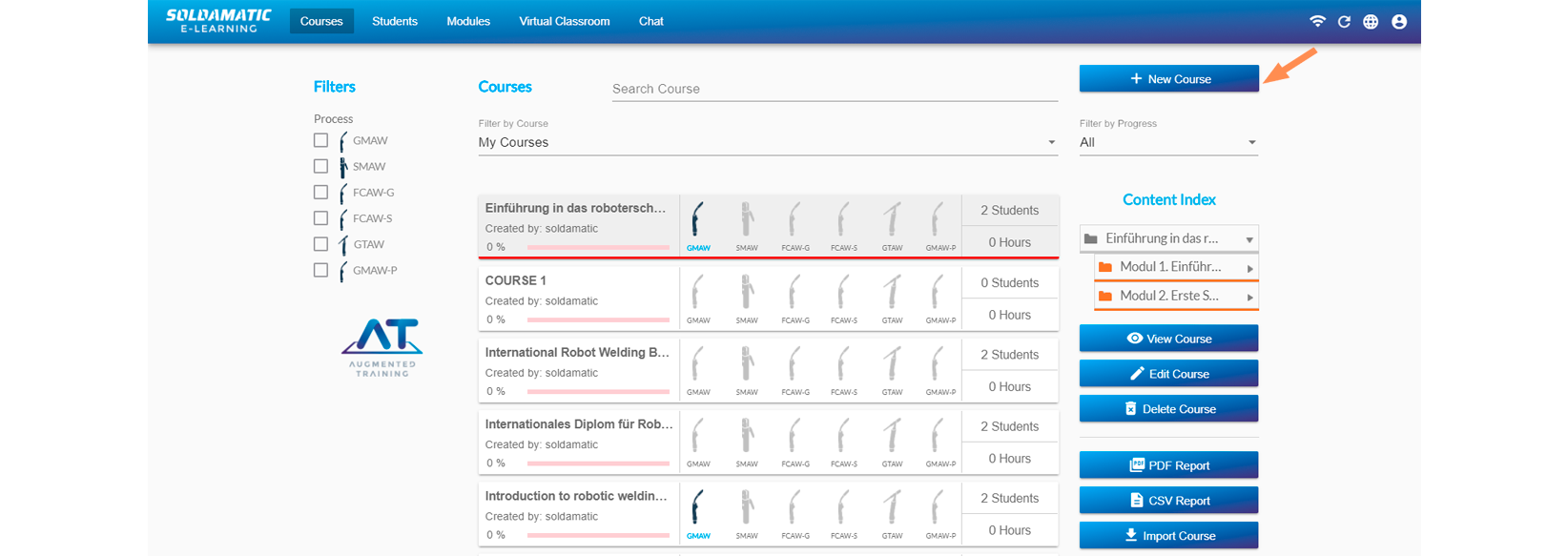 Navigate to the «Augmented Training. Soldamatic Welding Curricula» and click on it. You will see the course tree.