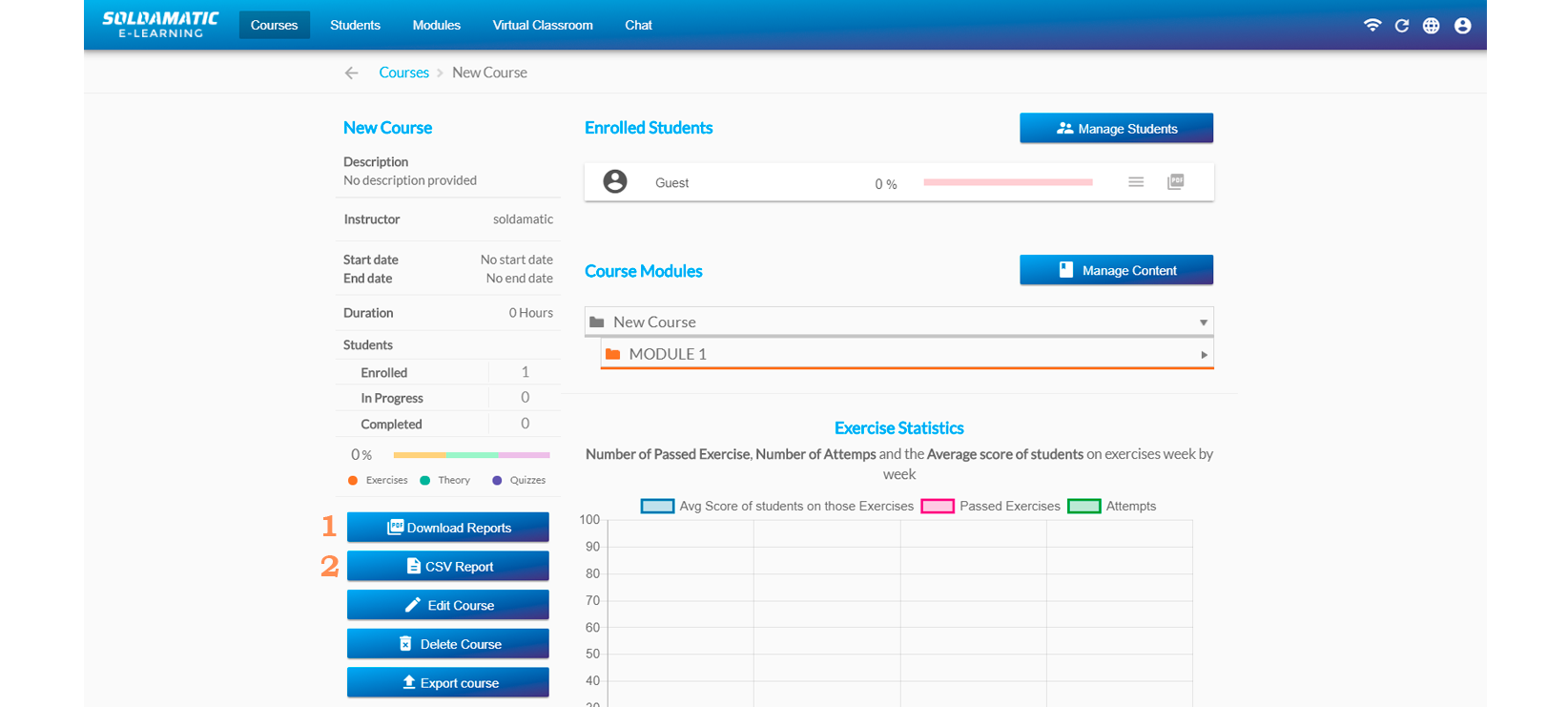 Once in the course view you will be able to download the reports as follows: