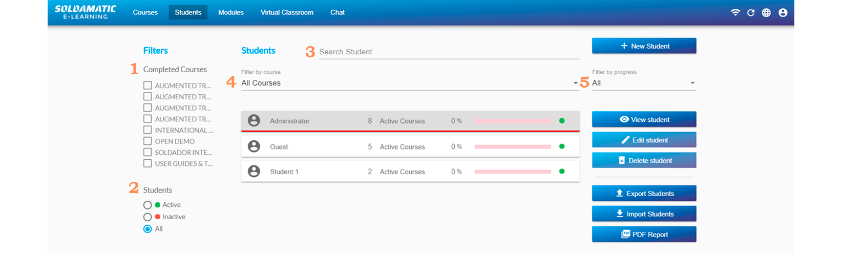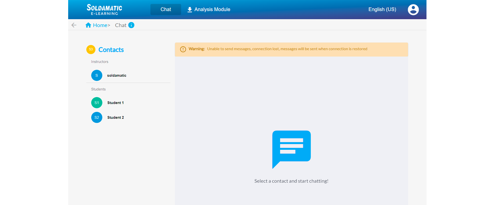 If you have Soldamatic e-Learning without a connection to a simulator, you will only be able to see some of the functionalities that this complete educational solution allows, i.e. connected to a Soldamatic simulator.