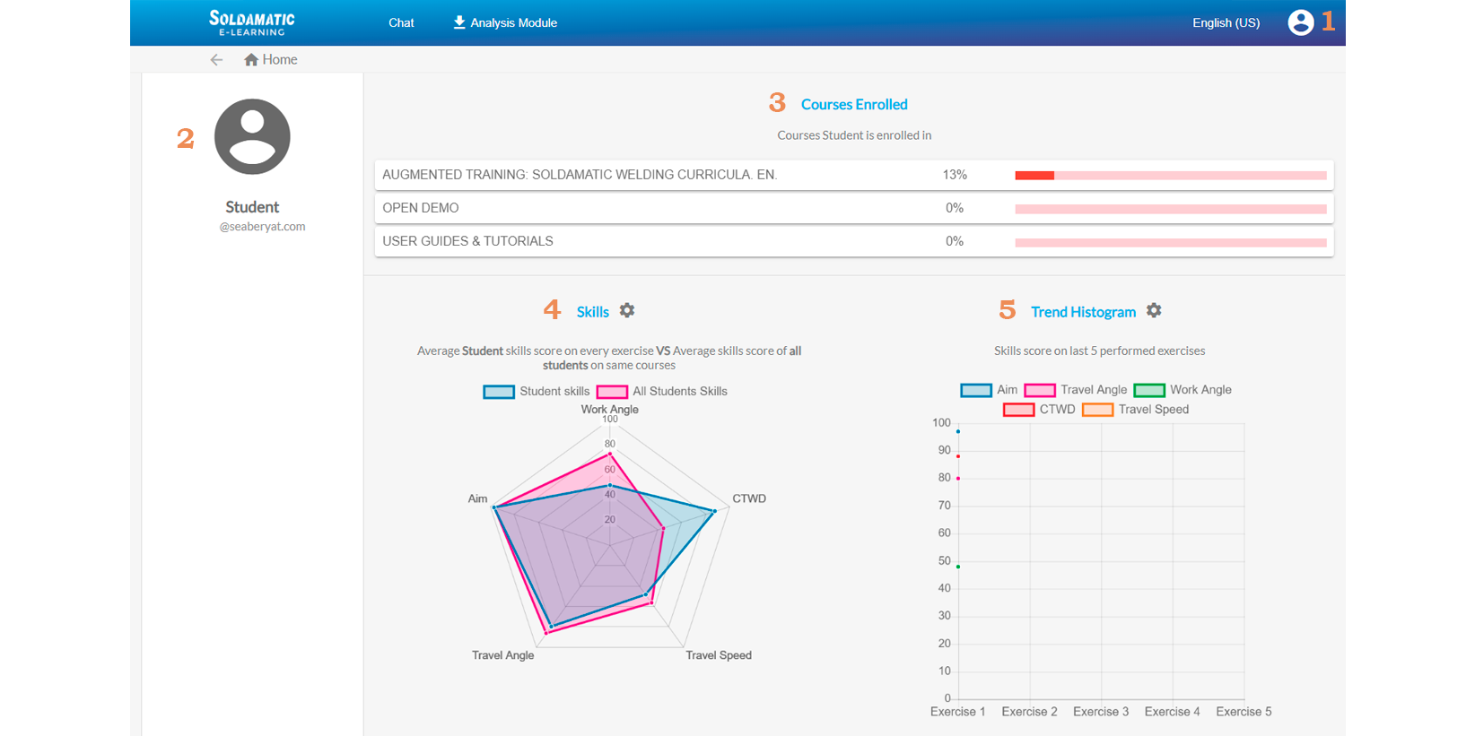 - Progress Monitoring: Provides tools to track students’ progress, such as visualization of theories, exams and welding practices with a detailed analysis of the welding result, comparative graphs with the rest of the classmates, etc.