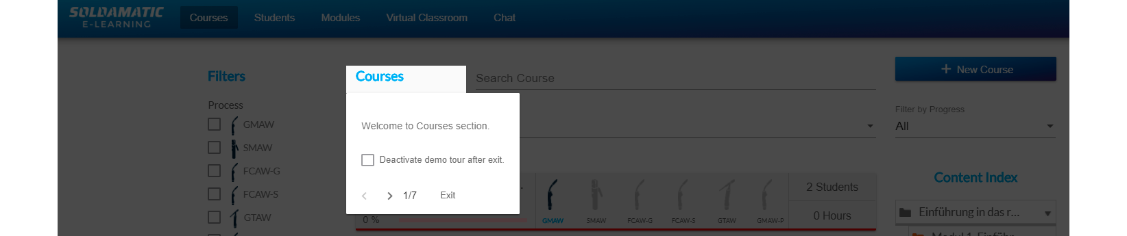 In «Demo tour»: the first time you access your Soldamatic e-Learning, a demo tour of the application will be activated, providing you with information on the 5 main sections.